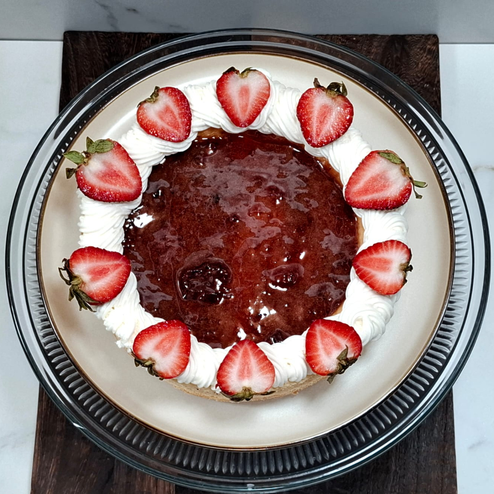 Crujiente base de galleta de mantequilla, combinación gourmet de dos quesos y mermelada de fresa de la casa con orilla de chantilly de nata.