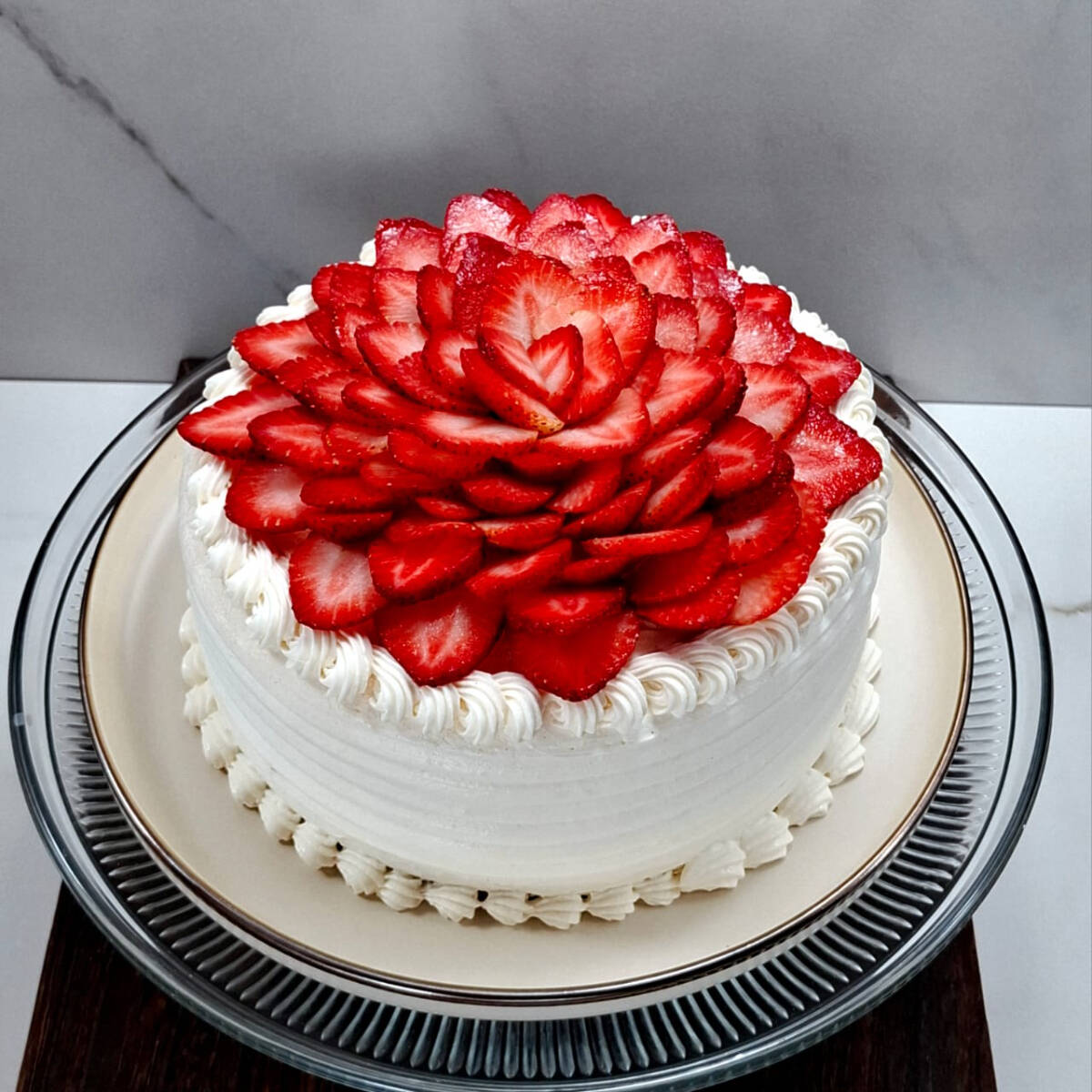 Casi 3 kg de tres capas de jugoso pan de vainilla bañado en tres leches con doble relleno de chantilly de nata cubierto con fresas frescas.