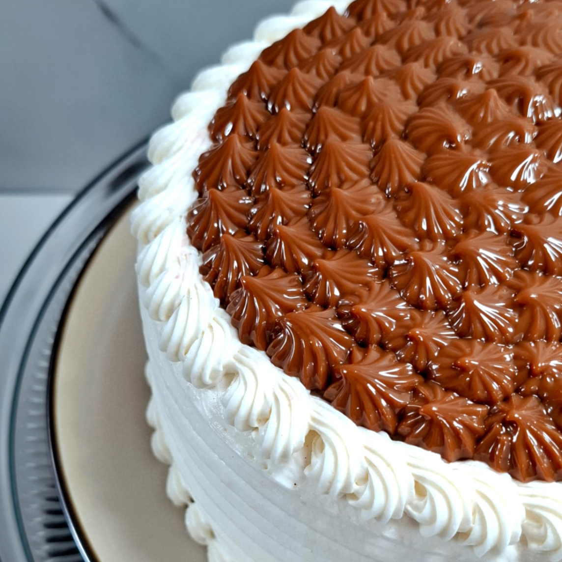 Casi 3kg de tres capas de jugoso pan de vainilla bañado en tres leches con doble relleno de chantilly de nata cubierto con dulce de leche.