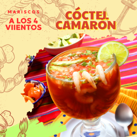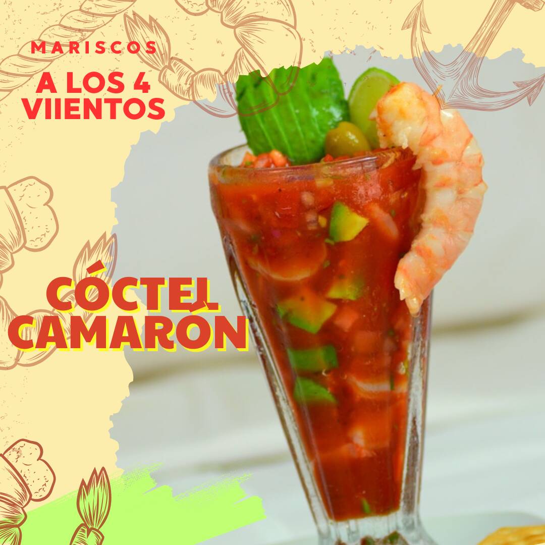 Cóctel de medio litro con preparado de catsup, camarones, cebolla, cilantro y aguacate. Incluye totopos