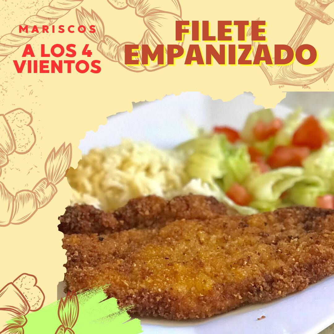 Filete de pescado empanizado, acompañado de arroz y ensalada. Incluye tortillas y salsa.