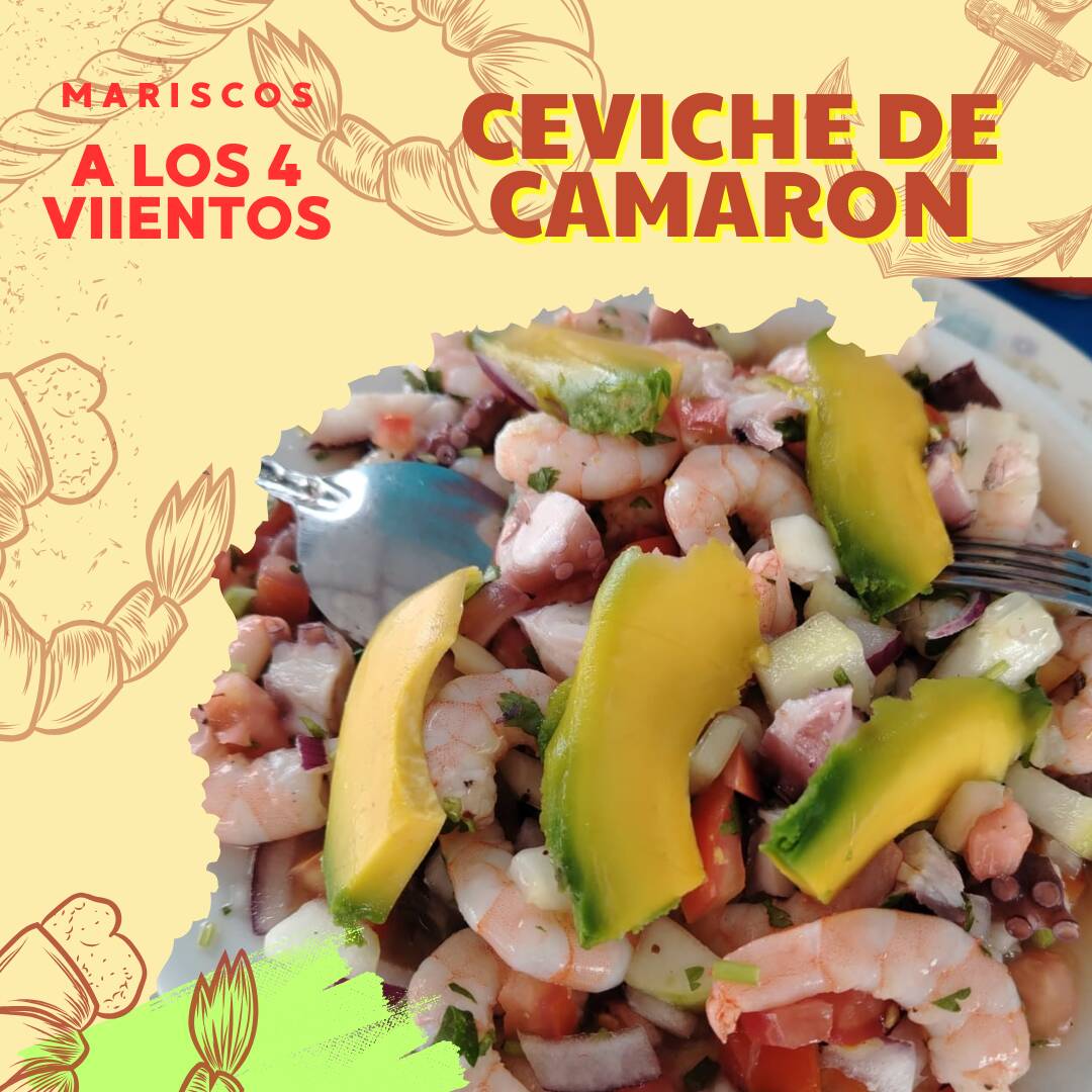Ceviche de medio litro de camarón con cebolla, jitomate y pepino. Incluye totopos y salsa