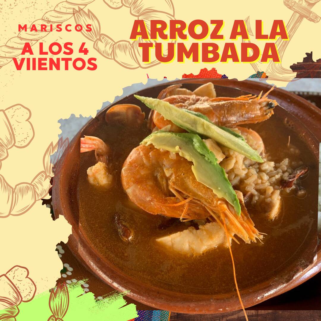 Un litro de arroz a la tumbada con mix de mariscos, camarón, pulpo, pescado, jaiba, ostión, mejillones. Incluye totopos.
