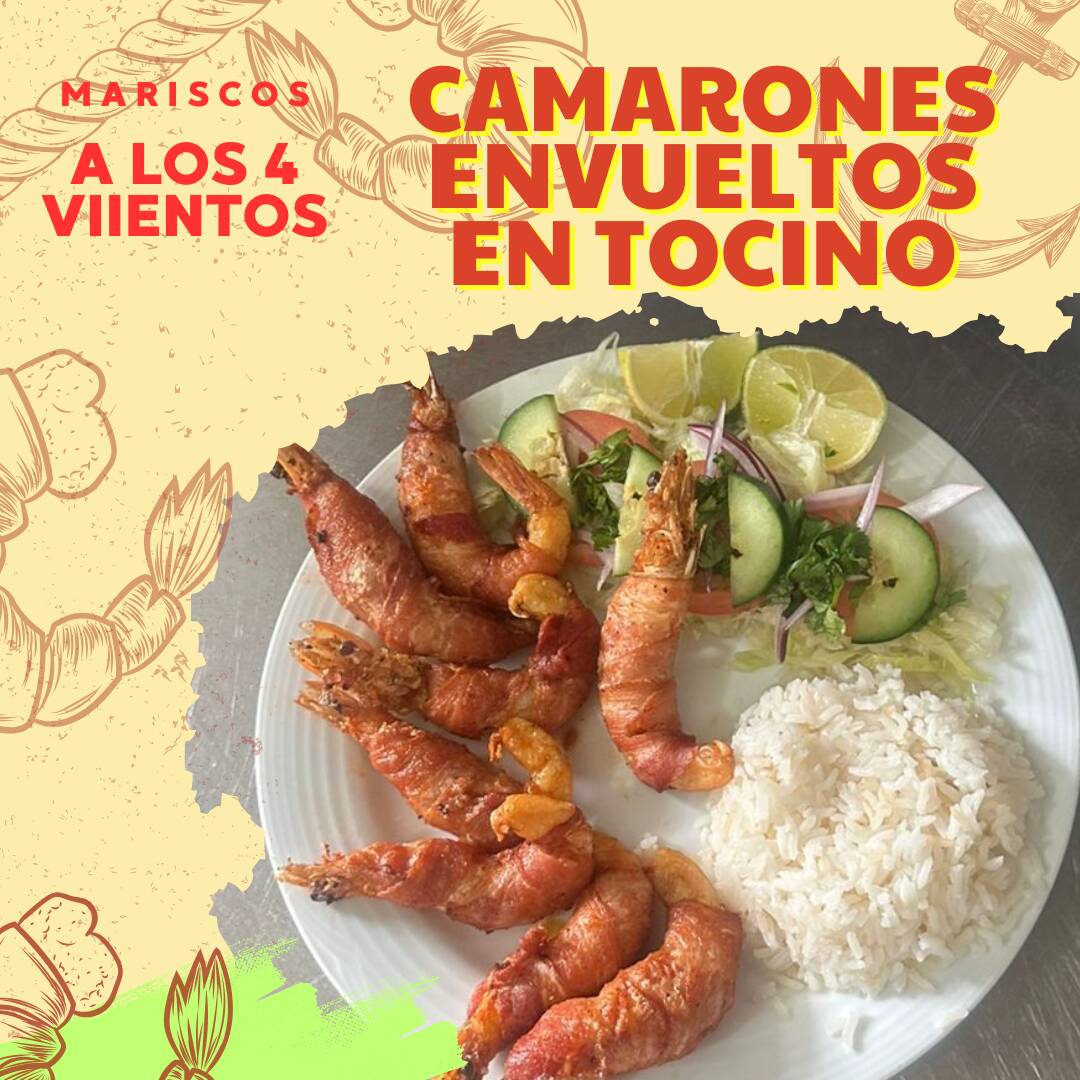 Orden de camarones envueltos en tocino, ensalada, arroz y salsa