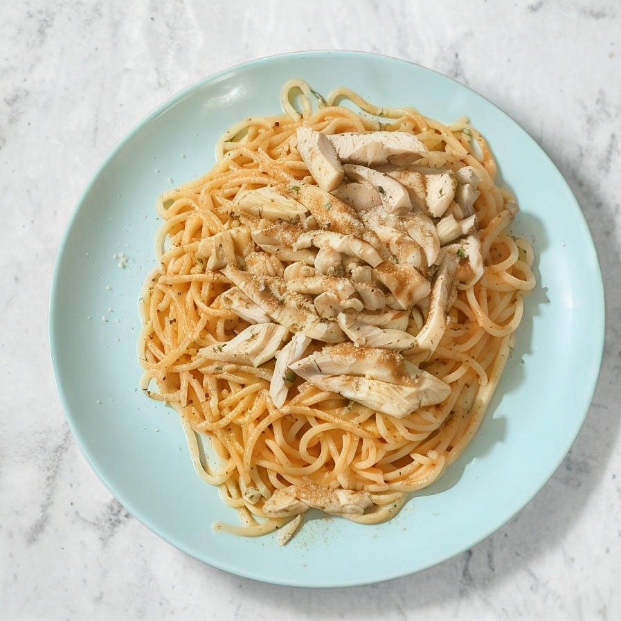 Espaguetico con pollo y queso parmesano, 180 g de pollo a la plancha, Y 250 gr de espagueti con salsa crema y un dash de salsa de tomate, Acompañado de salsa y 2 rebanadas de pan