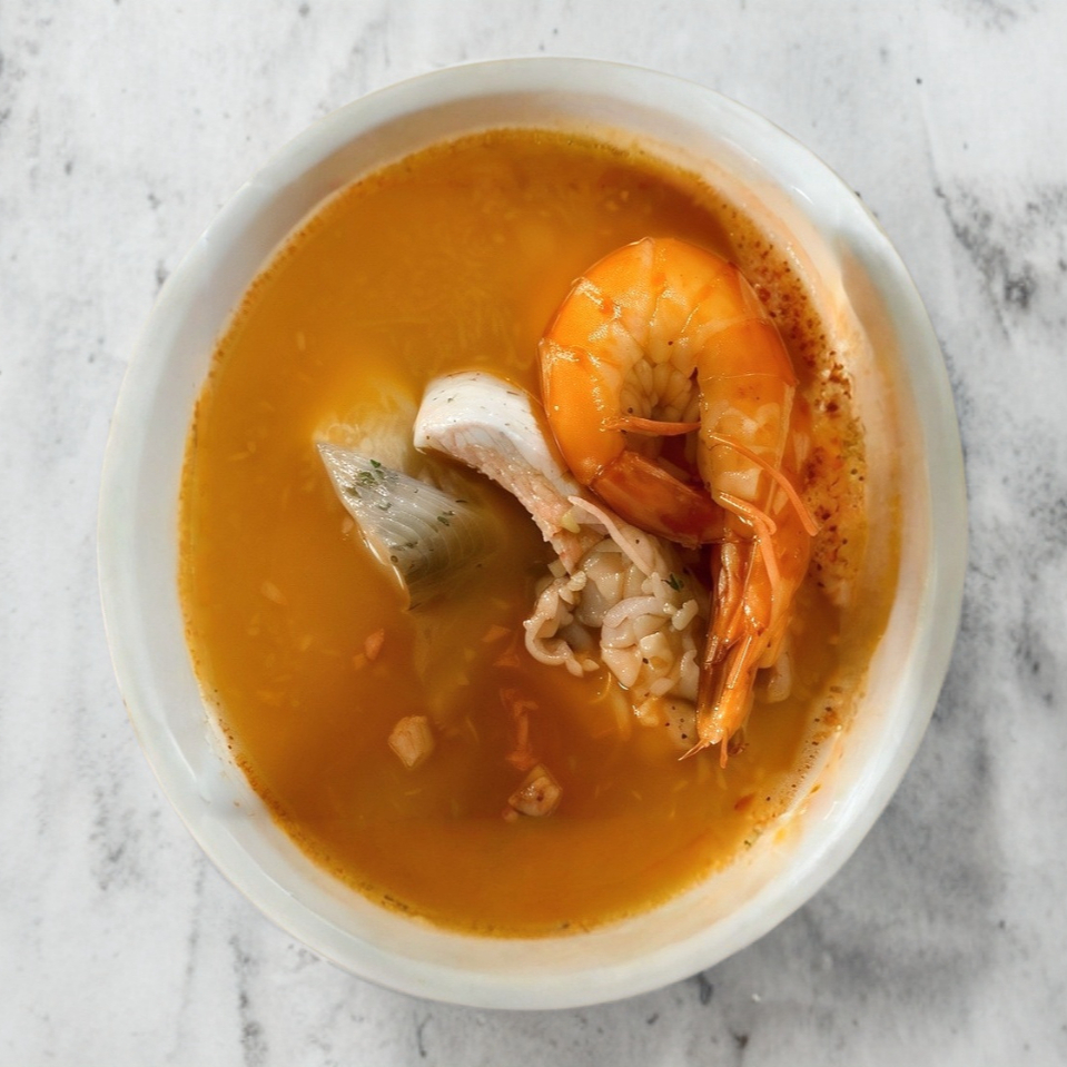 1 l de caldo de robalo Con camarón grande con cabeza y posta de robalo, Acompañado con cebolla blanca, Cilantro, Habanero, Limón y tortillas