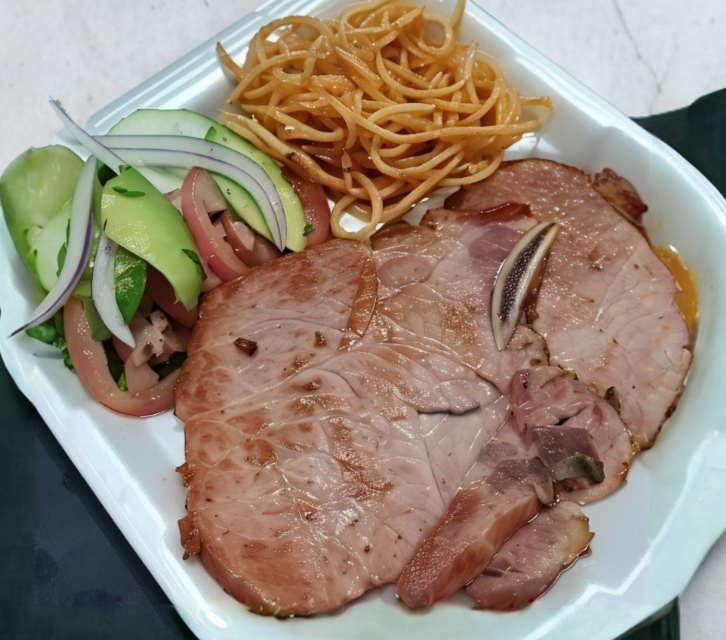 2 pz De chuleta a la plancha acompañada de mix de ensalada y espagueti tomate, Tortillas y salsa habanera