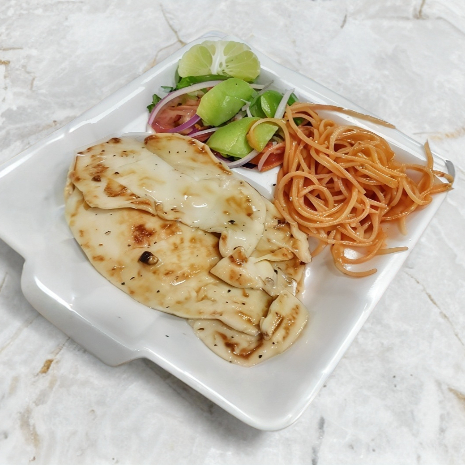 220 gr De pollo a la plancha con espagueti, Tomate y ensalada, Aguacate tortillas y salsa habanera