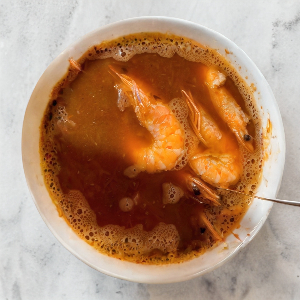 1 litro de caldo de camaron, 260 gm de camaron grande con cabeza, acompañado con cebolla blanca, cilantro abanero picado y tortillas
