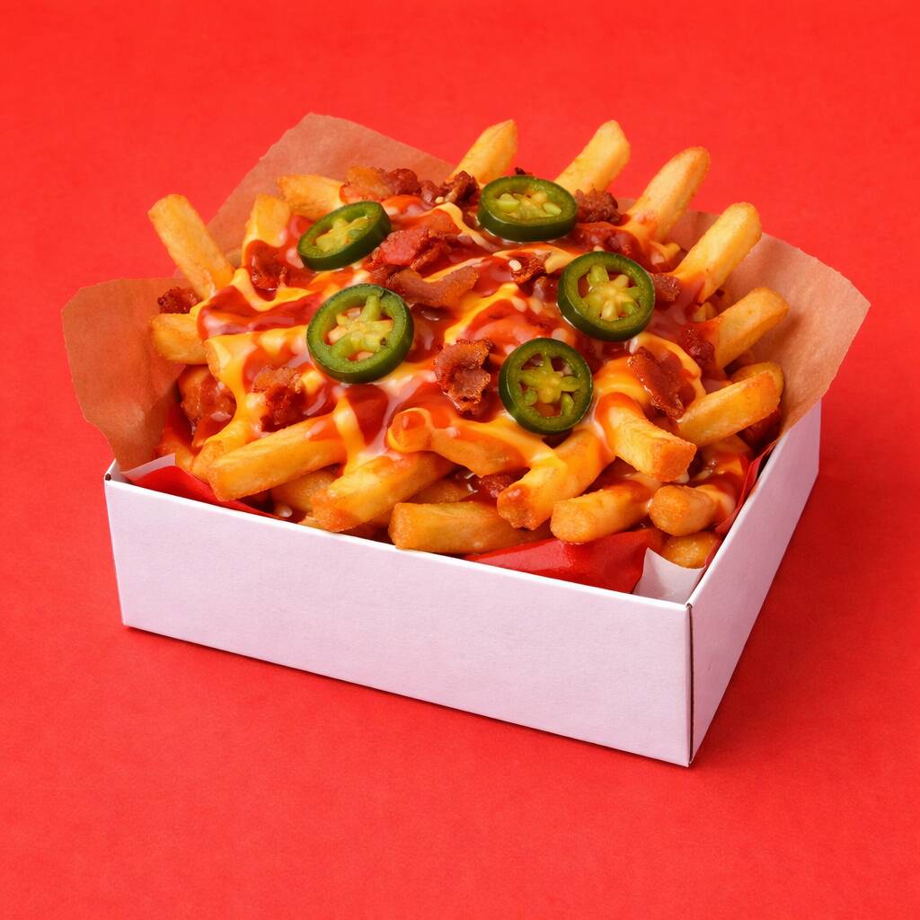 Deliciosas papas preparadas con pepperoni, tocino y rodajas de jalapeño encima, acompañadas de 3 salsas a tu elección para mezclarlas como quieras, crujientes por fuera y suaves por dentro, bañadas con una generosa capa de queso cheddar cremoso que las vuelve irresistibles, el complemento perfecto para tus alitas o boneless, porción: 250 g.