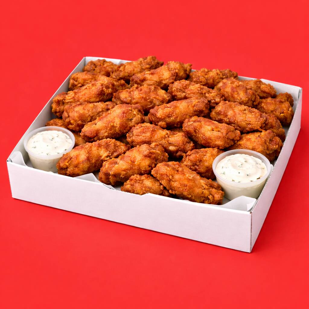 Box alitas mediano, el doble de sabor y antojo, incluye entre 16 y 20 pzas de alitas con cubierta crujiente, bañadas en hasta dos salsas de tu elección y acompañadas de ranch cremoso, ideal para compartir o disfrutar a lo grande.