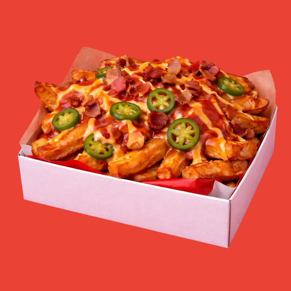 Deliciosas papas preparadas con pepperoni, tocino y rodajas de jalapeño encima, acompañadas de 3 salsas a tu elección para mezclarlas como quieras, crujientes por fuera y suaves por dentro, bañadas con una generosa capa de queso cheddar cremoso que las vuelve irresistibles, el complemento perfecto para tus alitas o boneless, porción: 250 g.