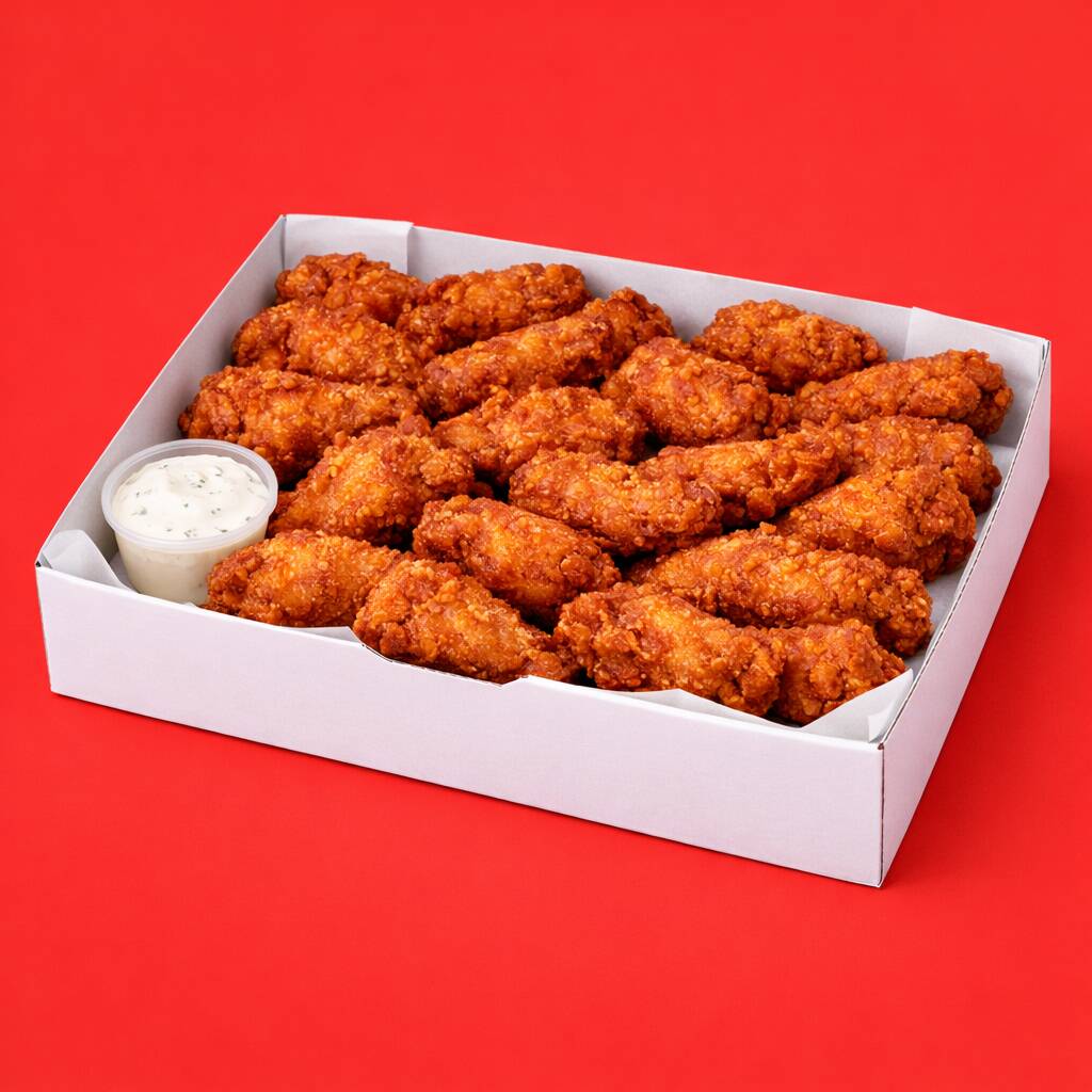 El tamaño perfecto para uno, incluye entre 250 g de tenders con cubierta crujiente, bañadas en la salsa de tu elección y acompañadas de ranch cremoso, ideal para un antojo personal.