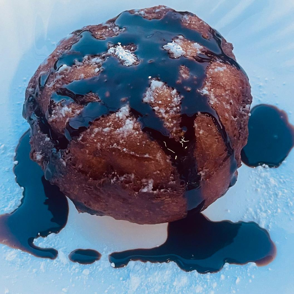 Helado frito un postre con una capa crujiente y por dentro caliente mientras el interior es suave y frio cubierto por chocolate,con un toque de azucar refinada y su cacahute triturado