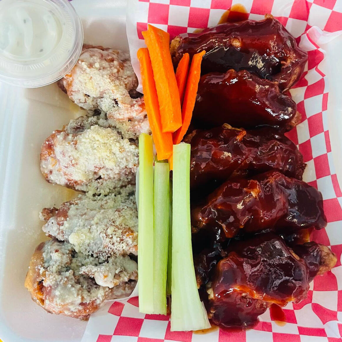 Alitas a la bbq y parmesano con el toque del sabor del pollo recien y salsa de la casa n matado