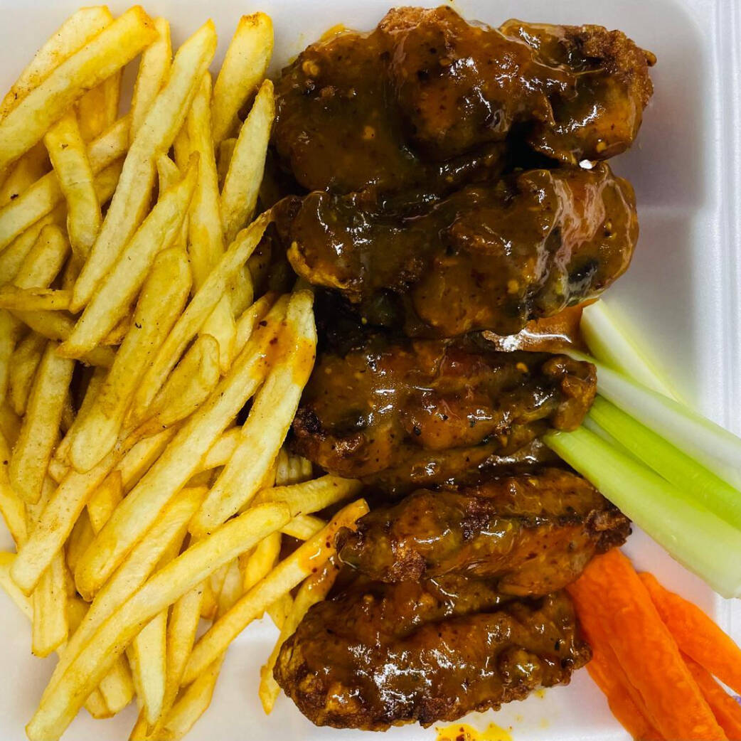 Una orden de alitas con su sabor de pollo recien matado a la bbq y sus papas a la francesa con su aderezo de capsu acompañdo de sus papas a la francesa