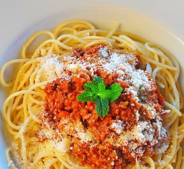 Deliciosa pasta a la boloñesa, acompañado de carne molida, un poco de crema y queso parmesano.Todos nuestros alimentos son preparados al momento.