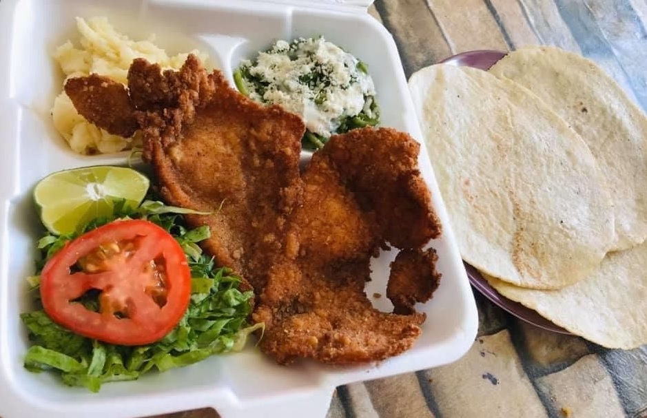Crujiente y deliciosa milanesa de pollo. Acompañado de 2 guarniciones a elegir y 3 tortillas hechas a mano. Todos nuestros alimentos son preparados al momento.