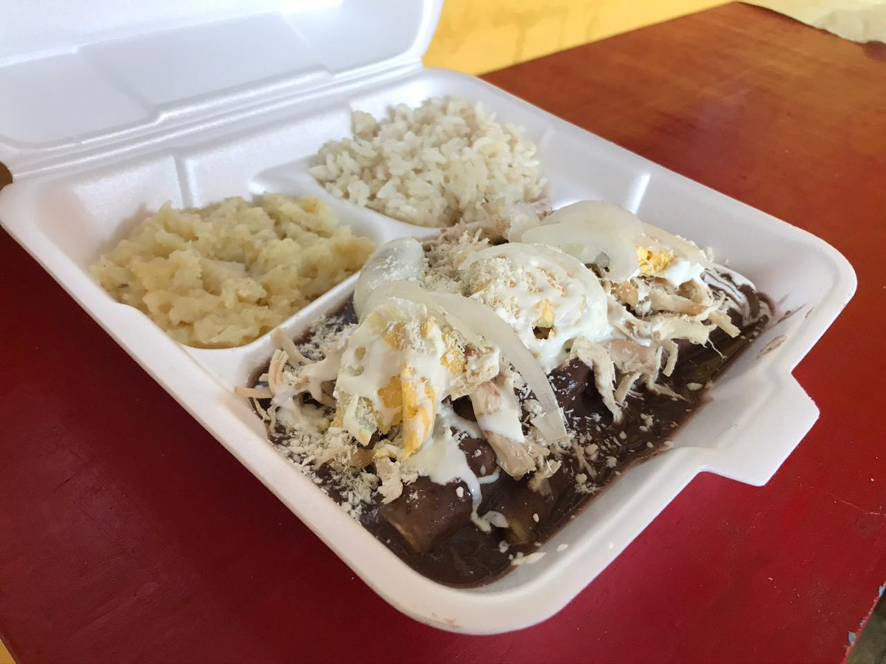 Deliciosas enchiladas de mole acompañadas de 2 guarniciones a elegir; servidas con lechuga, crema y queso. Todos nuestros alimentos son preparados al momento.