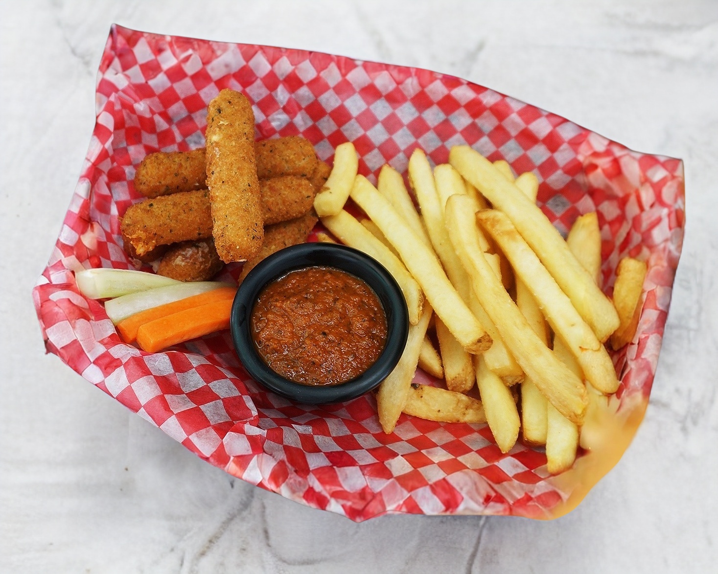 8 Piezas. Dedos de queso mozzarella con guarnición de vegetales y papas a la francesa.