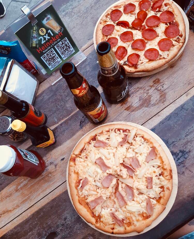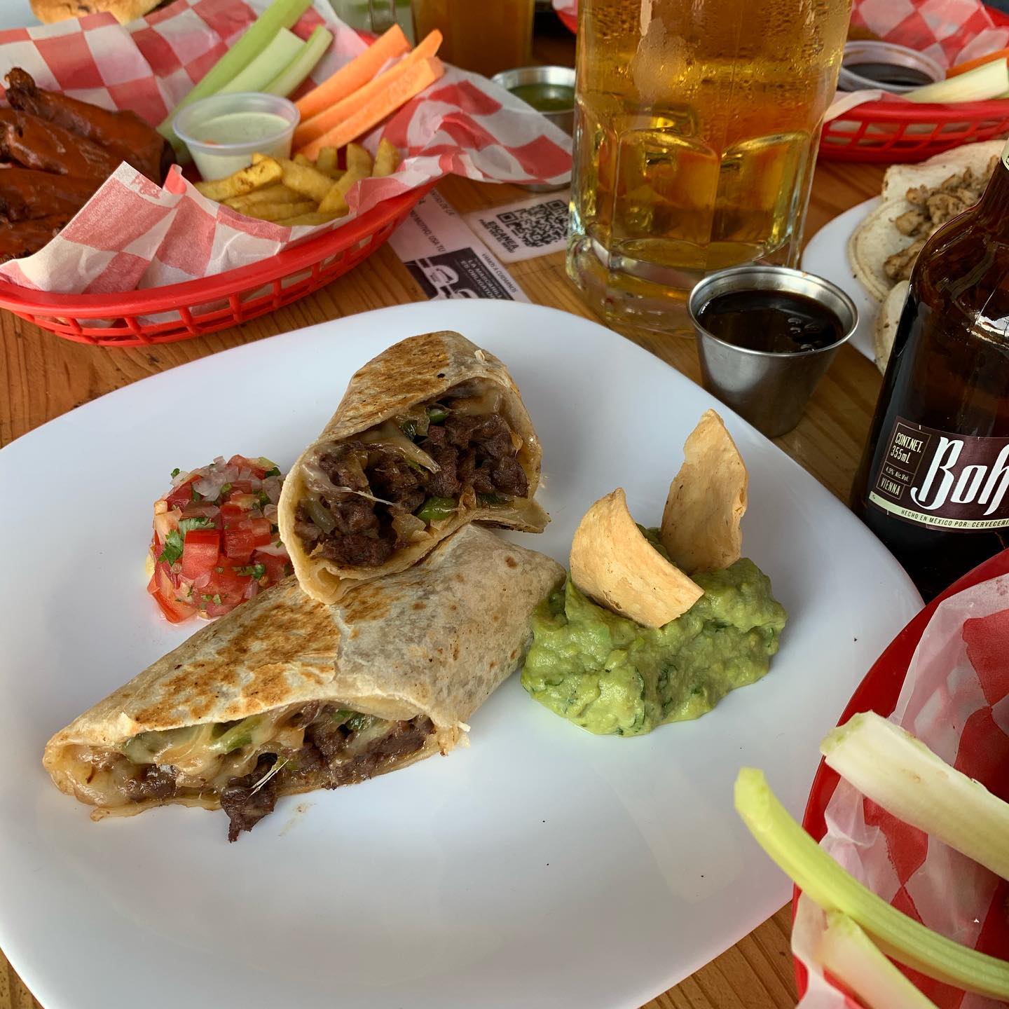 Tortilla de harina, pastor a la parrilla, pimiento morrón, cebolla, piña y queso manchego.