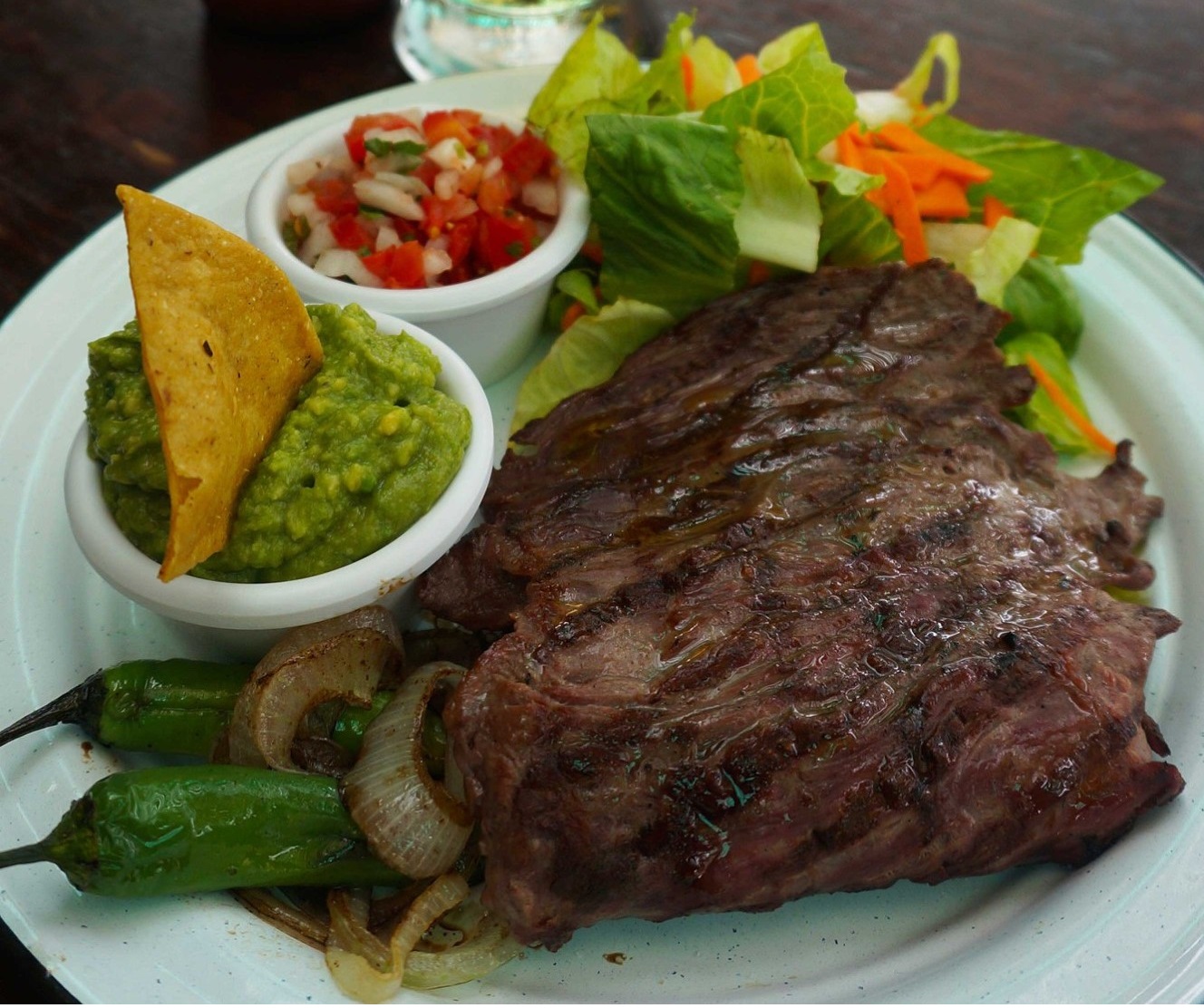 200 gr. de carne de sirloin de la casa con guacamole, queso manchego y vegetales frescos, incluye papas fritas.