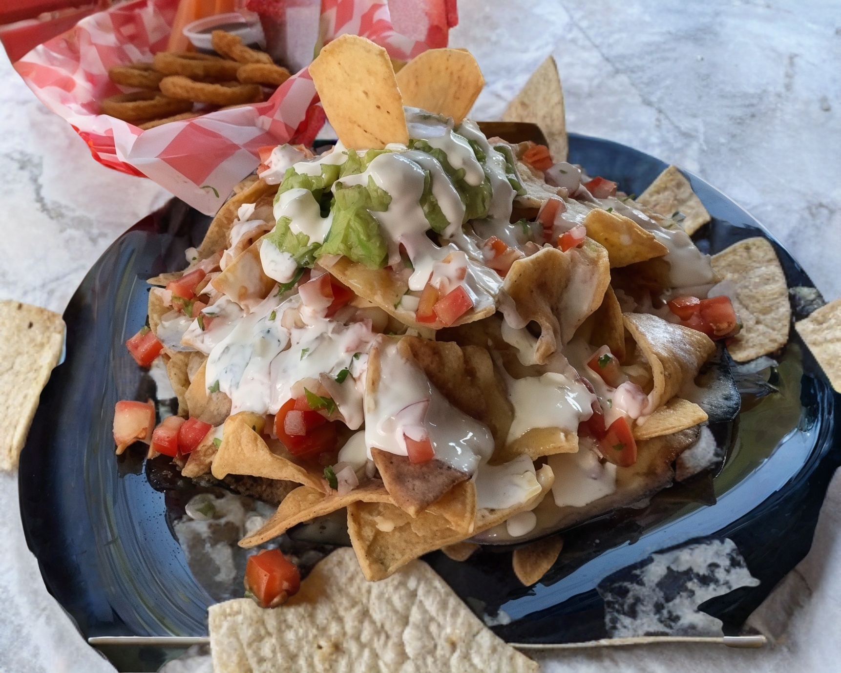 Dorados nachos bañados con frijoles refritos y queso gratinado, acompañado con pico de gallo, guacamole, crema y pollo.