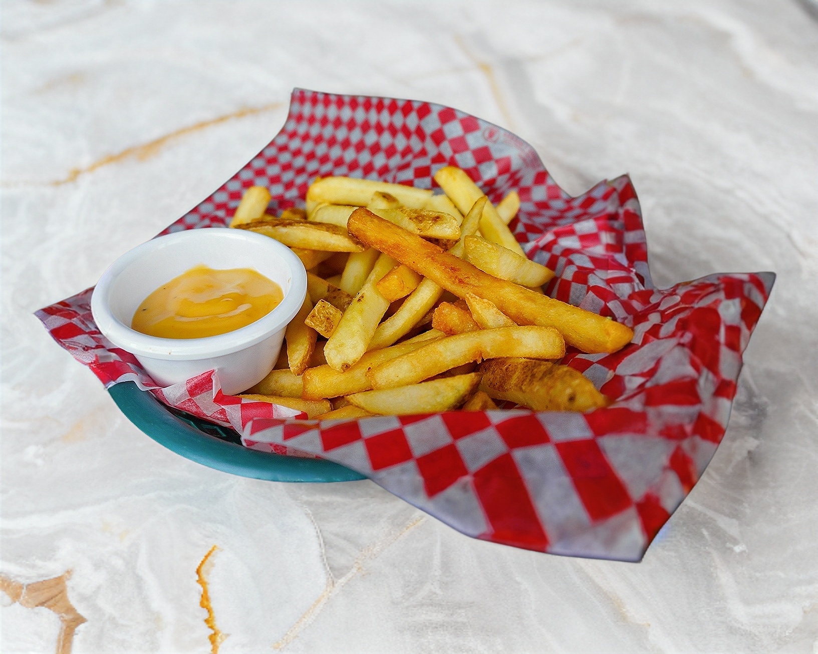 Generosa porción de papas fritas crujientes acompañadas de queso cheddar.