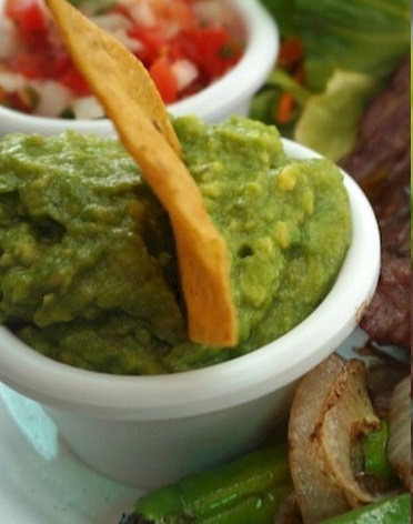 Orden de delicioso guacamole con totopos y salsa mexicana.