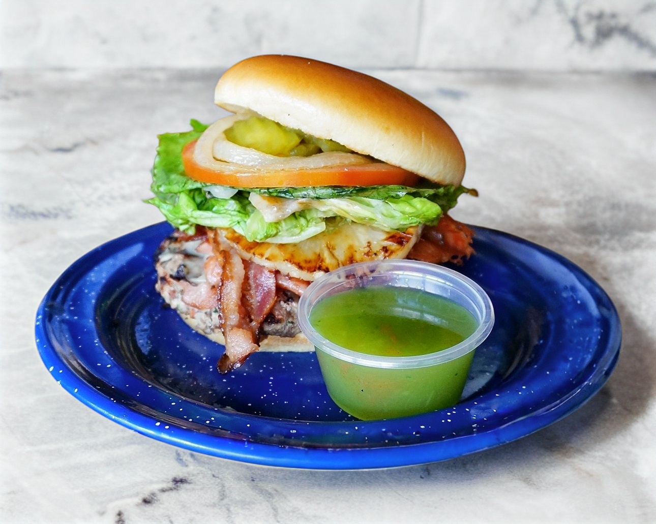 Carne de sirloin de la casa, piña, jamón, queso manchego, tocino y habanero, incluye papas fritas.