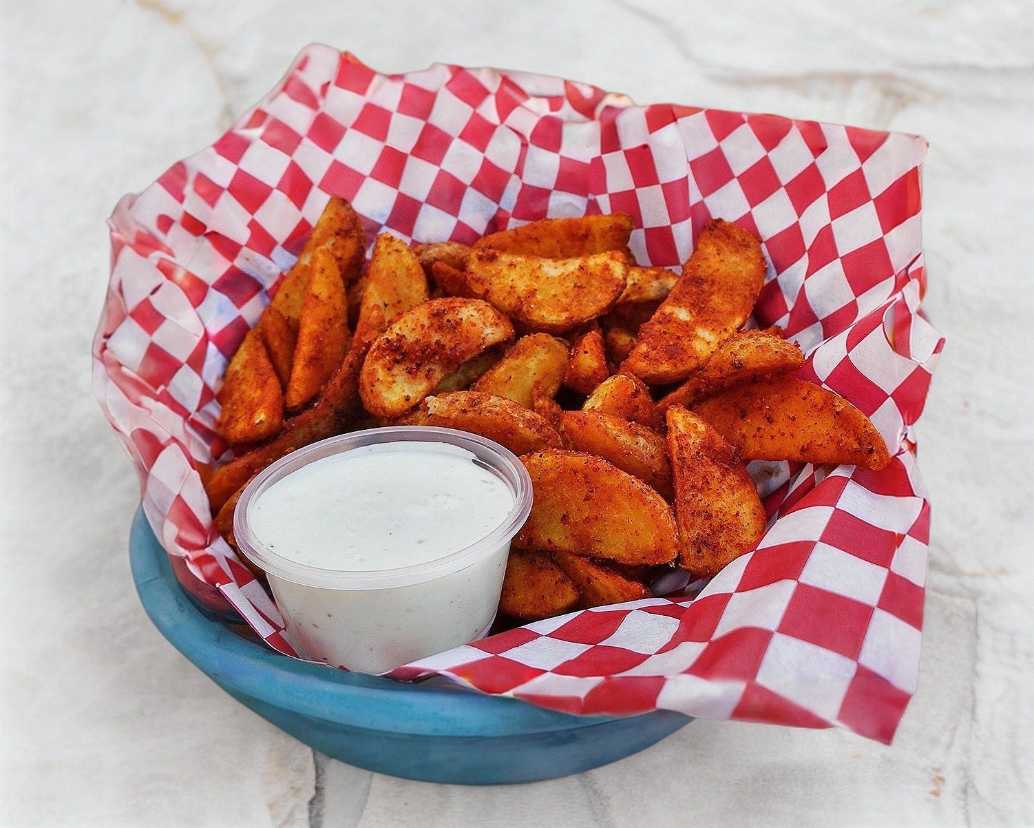 Papas gajo sazonadas con una mezcla de chiles y hierbas, acompañadas de aderezo ranch.