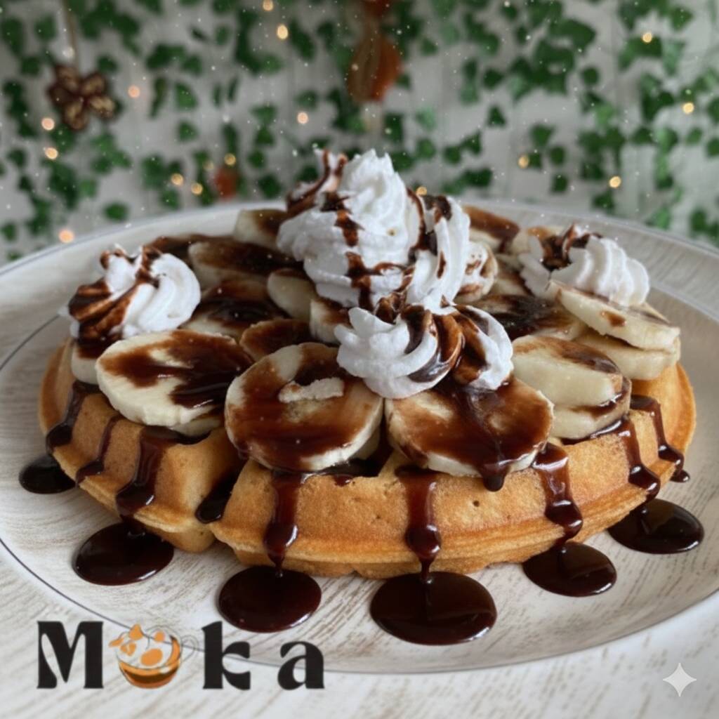 Waffle Dulce: Plátano suave Crema chantilly ligera Chocolate derretido rico En breve: Un waffle crujiente cubierto de ingredientes dulces y deliciosos.