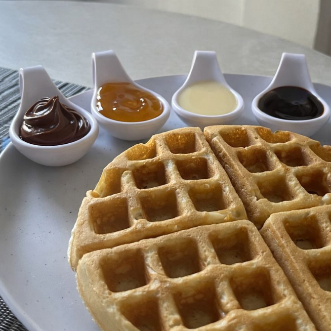 Waffle Natural con 2 Toppings: Un waffle dorado y crujiente, listo para ser personalizado con dos deliciosos ingredientes a tu elección.