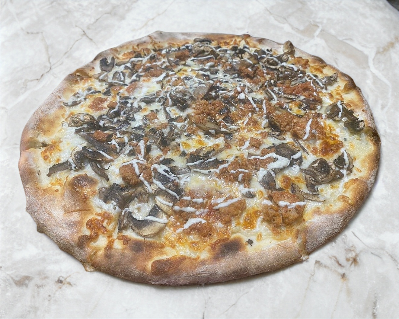 PIZZA A LOS CUATRO QUESOS CON SALSA BOLOÑESA, CHAMPIÑONES, CREMA, ACEITE DE OLIVO, PIMIENTA NEGRA Y ORÉGANO.