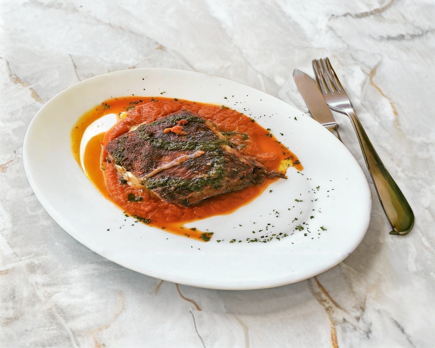 CALAMAR AL ESTILO VENECIANO, RELLENO DE VERDURITAS Y MARISCOS MIXTOS, GRATINADO Y SERVIDO SOBRE SALSA MARINARA.