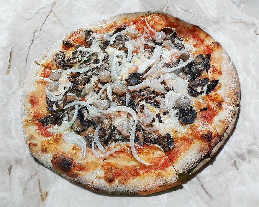 SALSA DE TOMATE, QUESO MOZZARELLA, CEBOLLA, CHORIZO ITALIANO, CHAMPIÑONES Y ACEITE DE OLIVO.