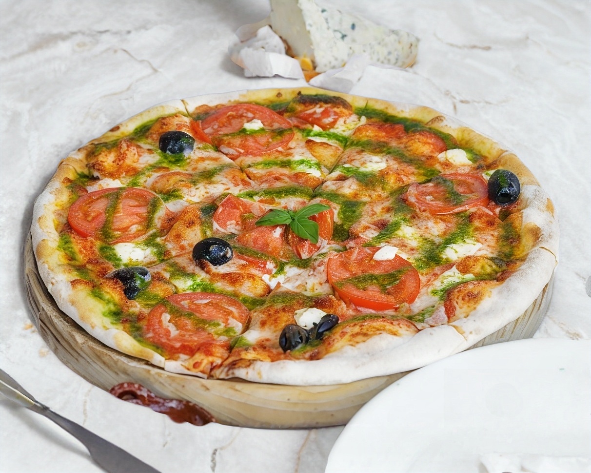 SALSA DE TOMATE, MOZZARELLA, JITOMATE FRESCO EN RODAJAS, QUESO DE CABRA Y ACEITUNAS NEGRAS.