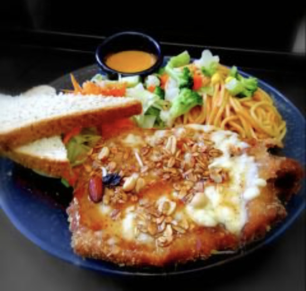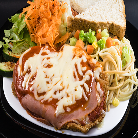 Pechuga Empanizada con salsa marinara y gratinada con ensalada y pasta