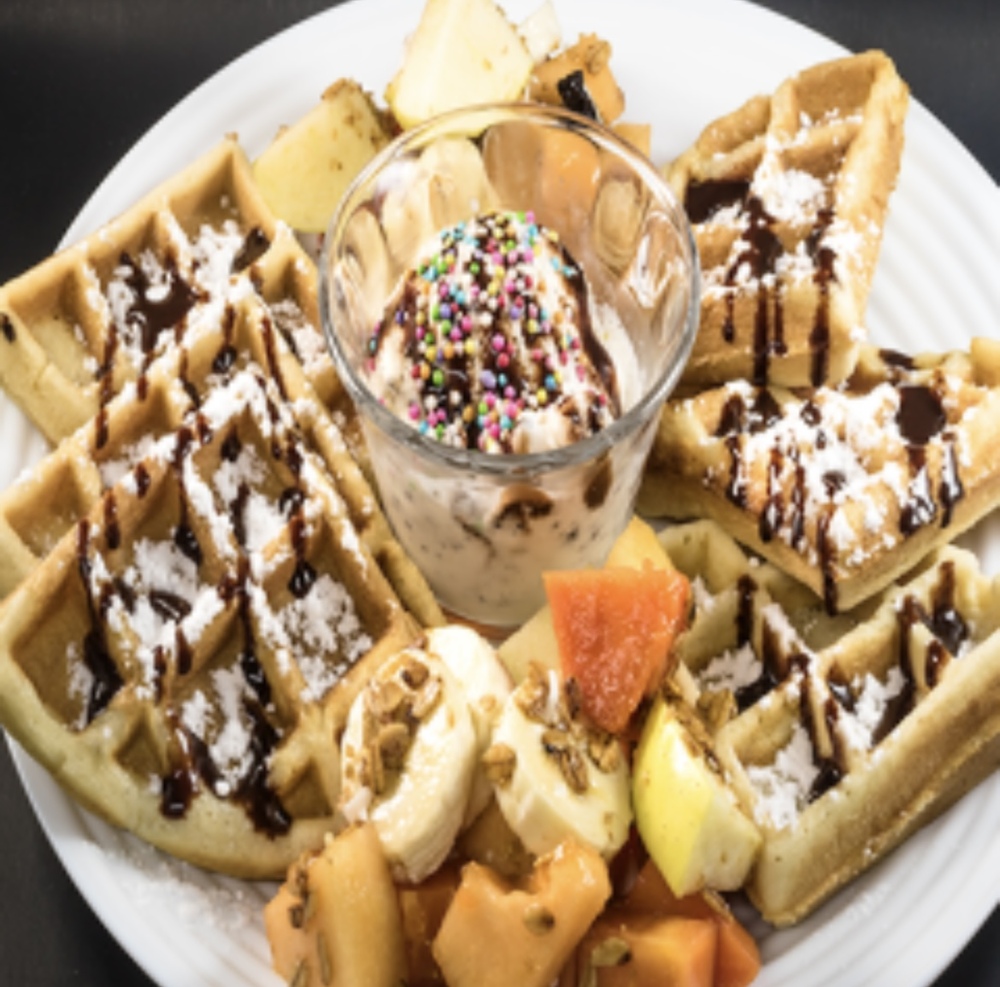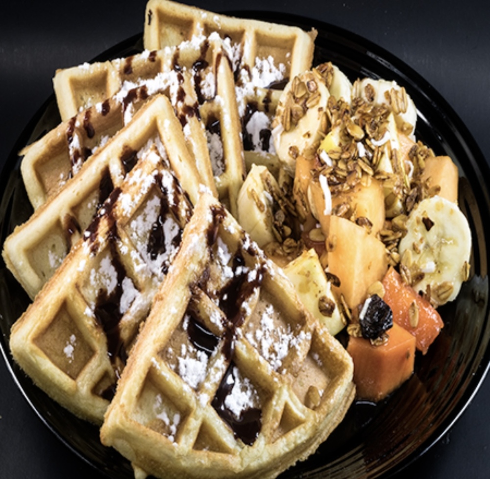 Tres waffles seccionados por la mitad acompañados de fruta dela estación