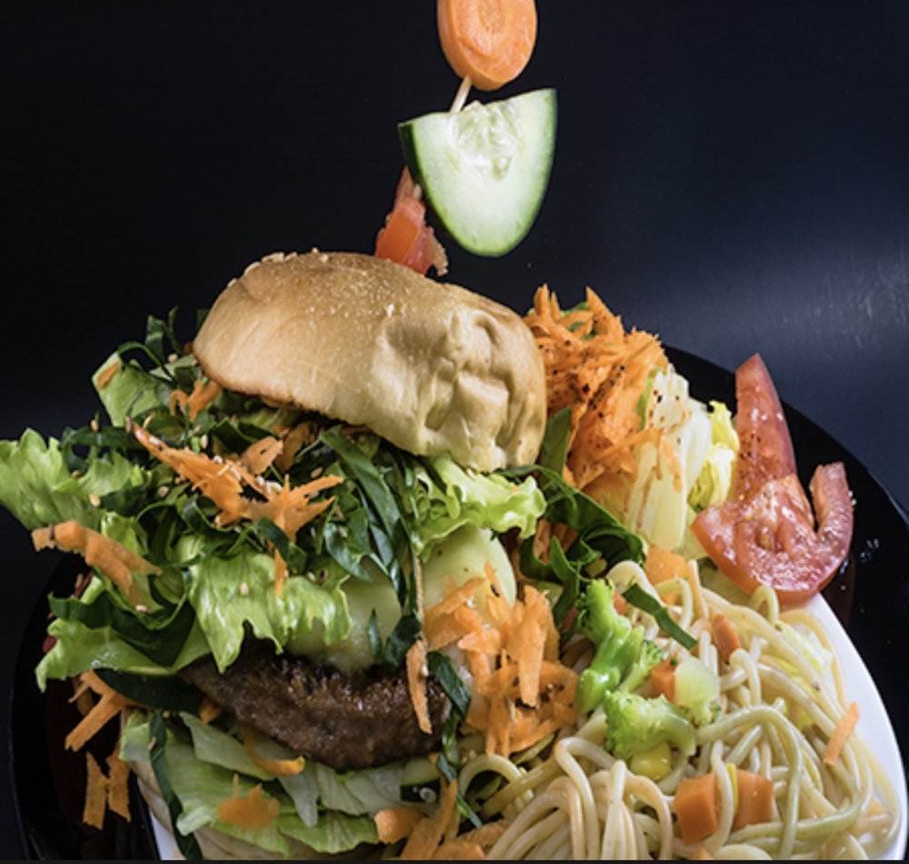 Hamburguesa Arrachera pasta ensalada y 1 botella de ice tea sabor manzana