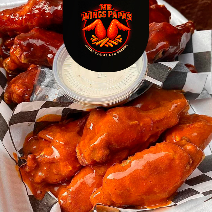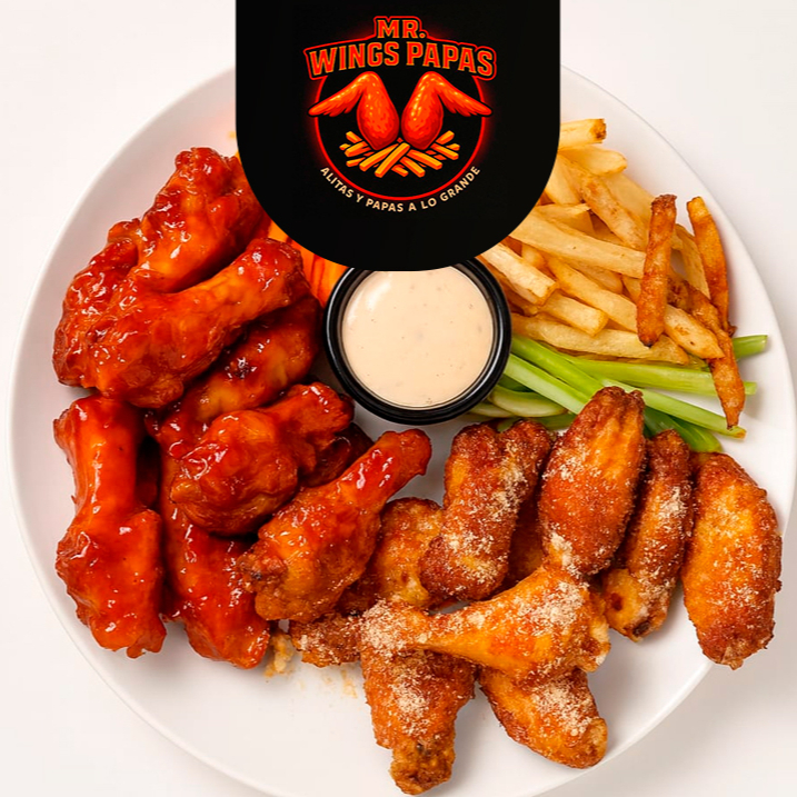 30 Alitas de buen tamaño, jugosas, crujientes y bien bañadas en la salsa de tu elección acompañadas de aderezo, zanahoria y apio.