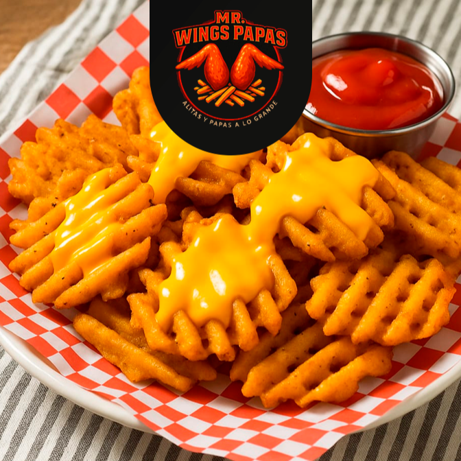 Papas fritas estilo rejilla o waffle fritas, acompañadas de queso amarillo y cátsup