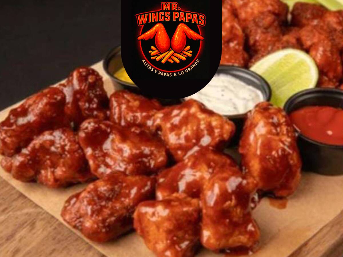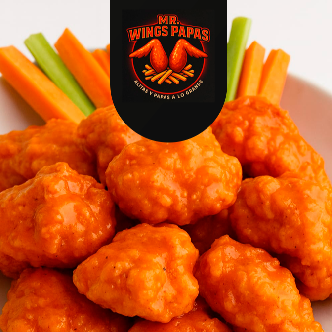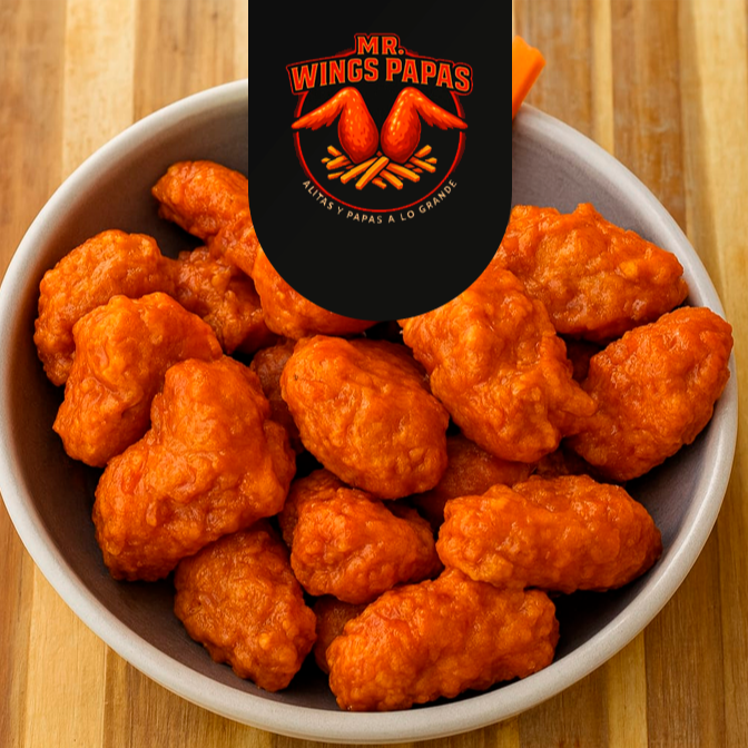 250 Gramos de Trozos de pechuga de pollo, bien crujiente, jugosos y bañados en tu salsa favorita.