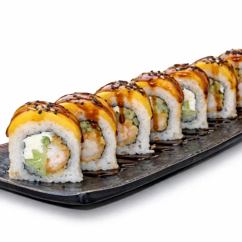 Por dentro: Queso Philadelphia, Tempura de Camarón y Pepino. Por fuera: Plátano , Salsa Anguila y Ajonjolí.