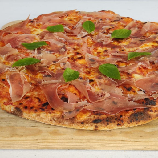 Masa y salsa de tomate especiales de la casa, mezcla de quesos especial de la casa, Jamón serrano y albahaca.