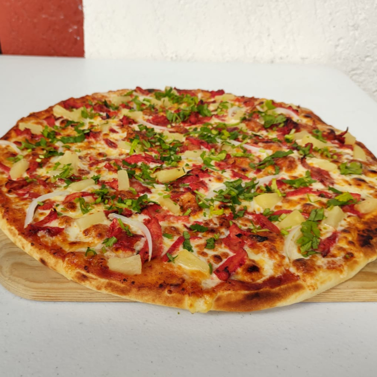 Masa y salsa de tomate especiales de la casa, mezcla de quesos especial de la casa, pastor directo de trompo, cebolla, piña y cilantro.