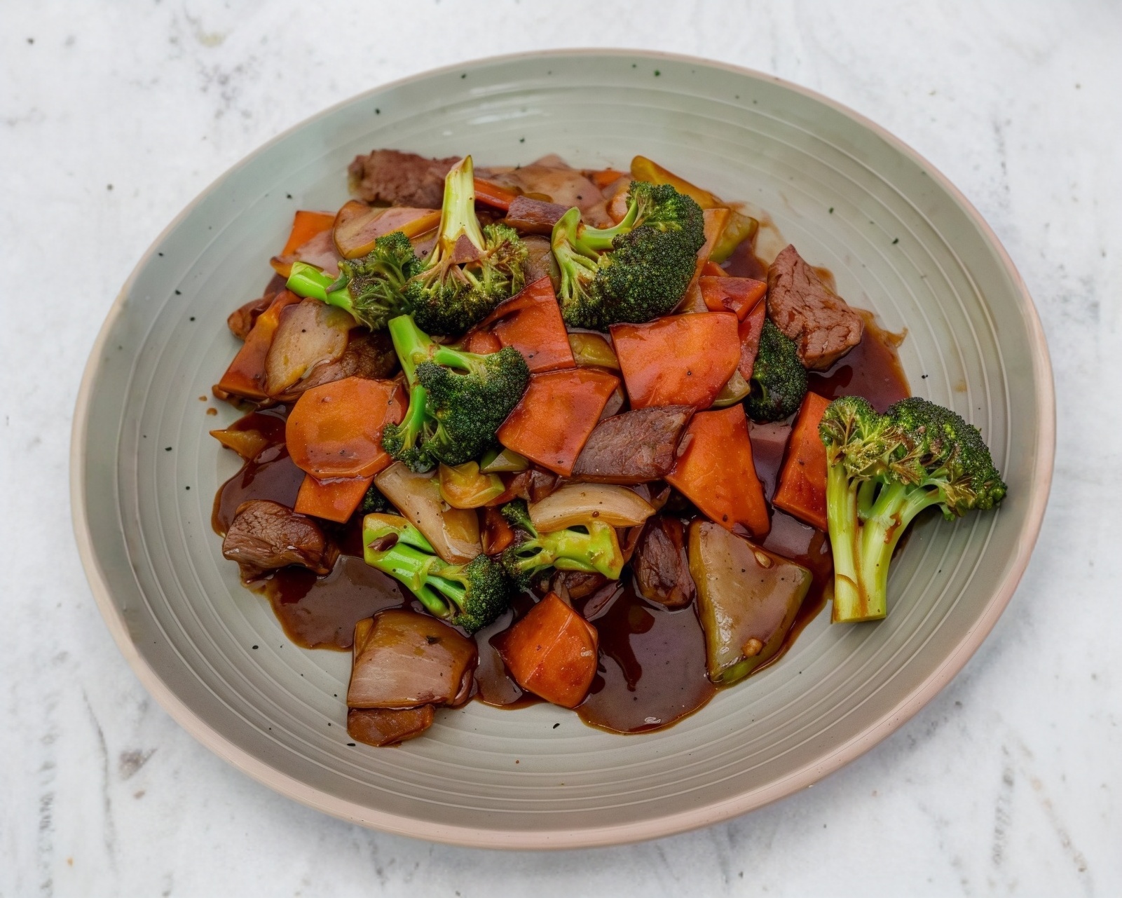 Orden de res salteado con salsa de soya, zanahoria, apio, cebolla más un complemento a elegir arroz o pasta. (900gr aprox.).