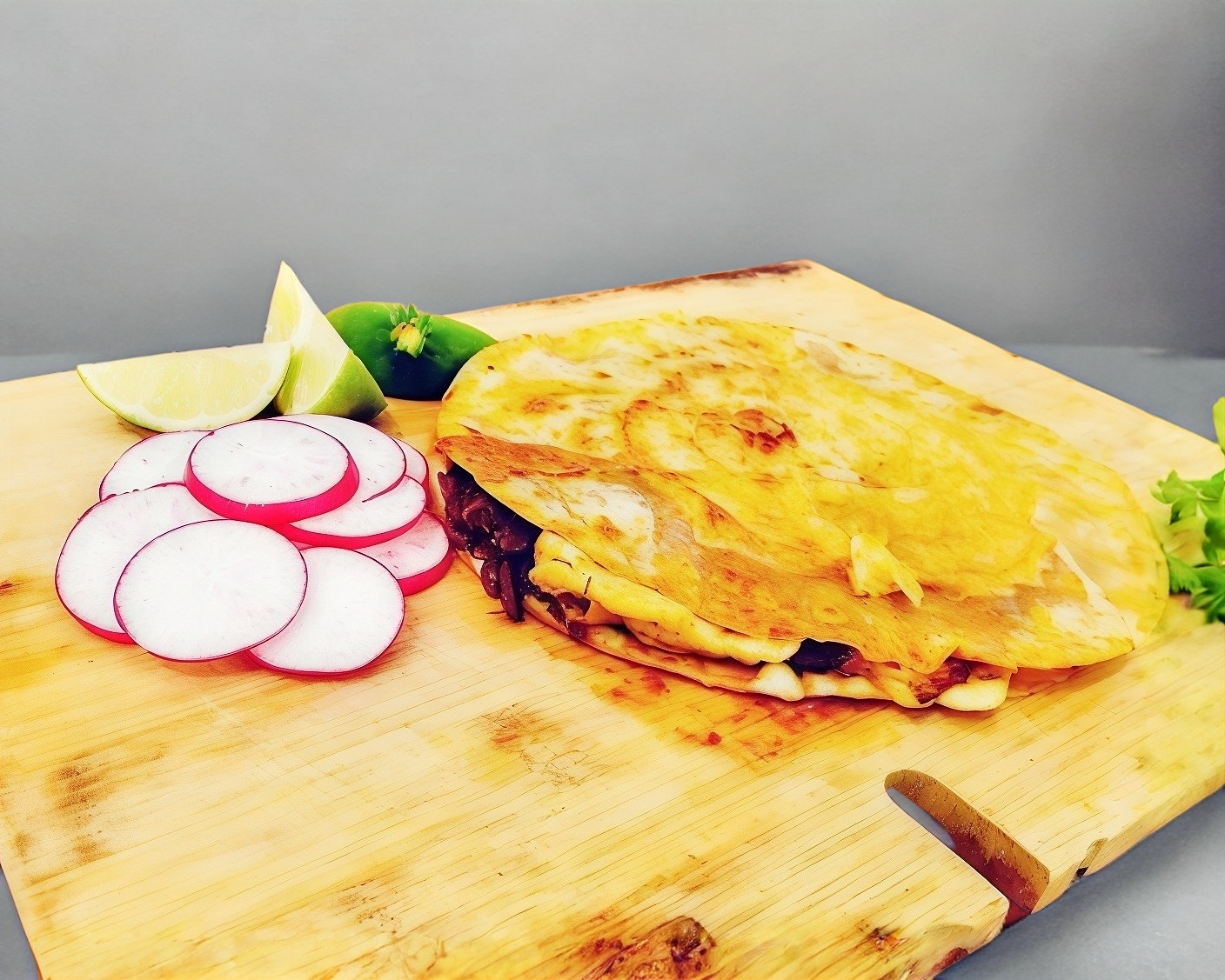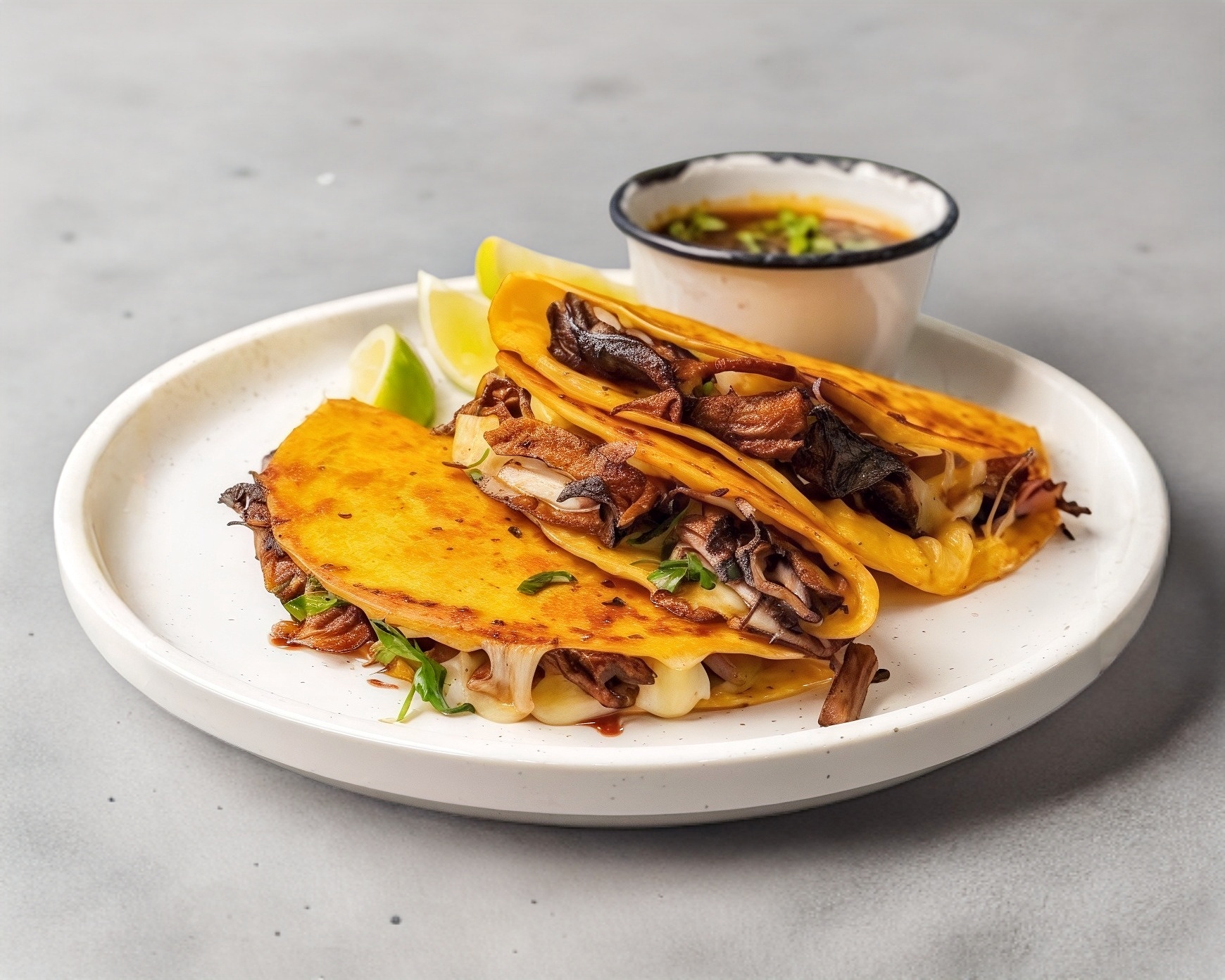 Doble tortilla de maíz remojado en consomé, queso oaxaca, 35 g birria, cebolla, cilantro, limón, salsa, por ud.