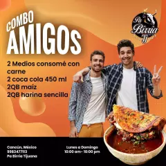 Incluye tortillas, 1/2 de consomé gratis, cebolla, cilantro, limón y salsa.