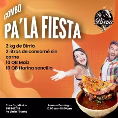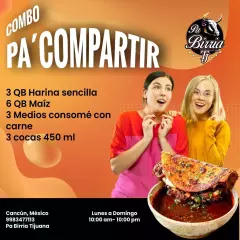 1 Kilo de carne, 1 litro de consomé cortesía, tortillas, salsas, limón, cilantro y cebolla.